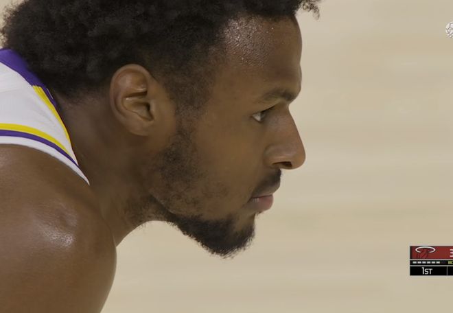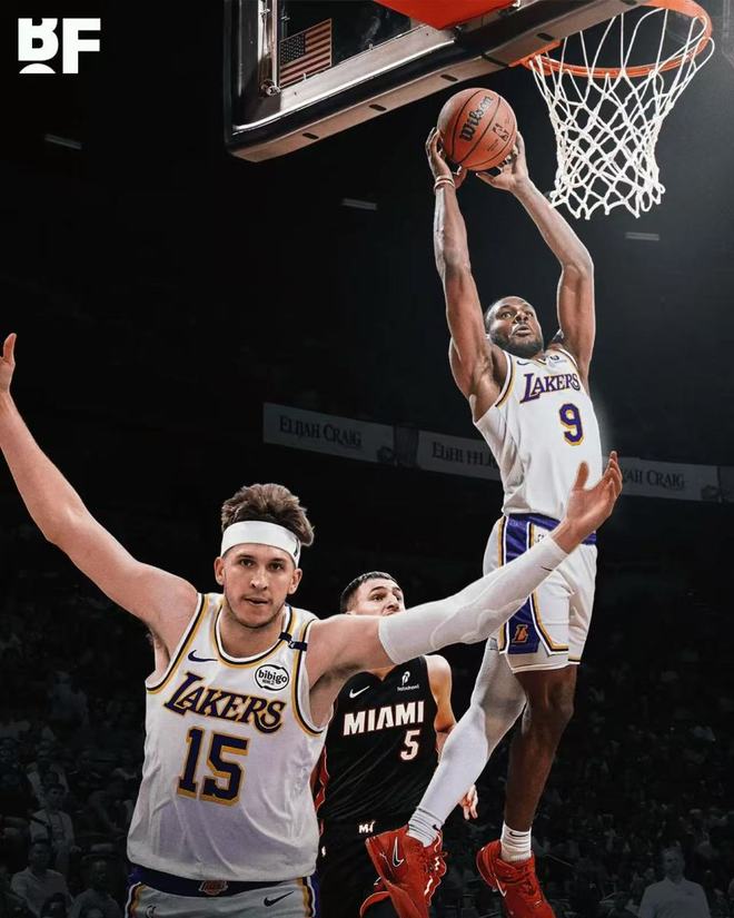 而且最重要的不光是這個(gè)小陣容,布朗尼還完成了他非常精彩的進(jìn)球,就算只有一個(gè)球也夠了,當(dāng)時(shí)我們看得很清楚,反擊當(dāng)中,里夫斯運(yùn)球布朗尼急速跟進(jìn),湖人這是一次快攻,所以熱火隊(duì)的防守已經(jīng)來(lái)不及了。此時(shí)里夫斯吸引了所有人防守之后把球高高拋起,布朗尼從左側(cè)切入,雙手接球完成了一次滑翔空接暴扣,他起跳高度極高,已經(jīng)直接平框了。